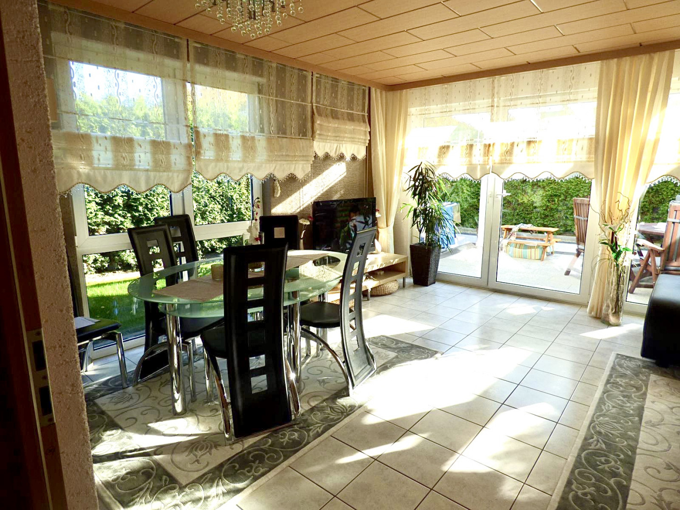 Hervorzuheben ist der große Wohn- und Essbereich mit Zugang zur überdachten Terrasse.